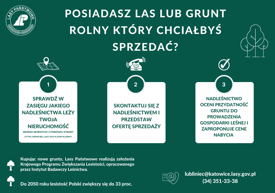 Nadleśnictwo Lubliniec informuje, że jest zainteresowane zakupem lasów oraz gruntów przeznaczonych do zalesienia i położonych w zasięgu terytorialnym nadleśnictwa.
